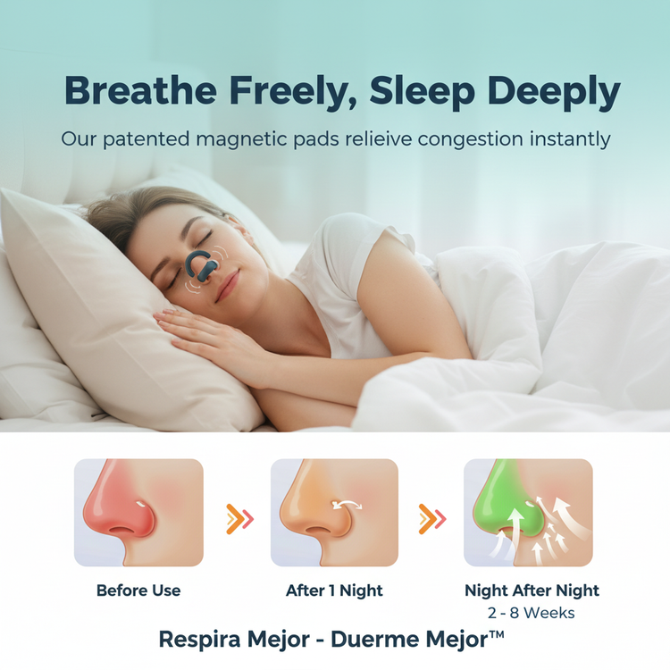 Respira Mejor - Duerme Mejor™ uses gentle magnetic expansion to widen nasal passages naturally, offering drug- and adhesive-free relief. Its hypoallergenic materials and secure fit ensure comfort for all-night wear, and the reusable, easy-to-clean design means you’re always ready for restful sleep.